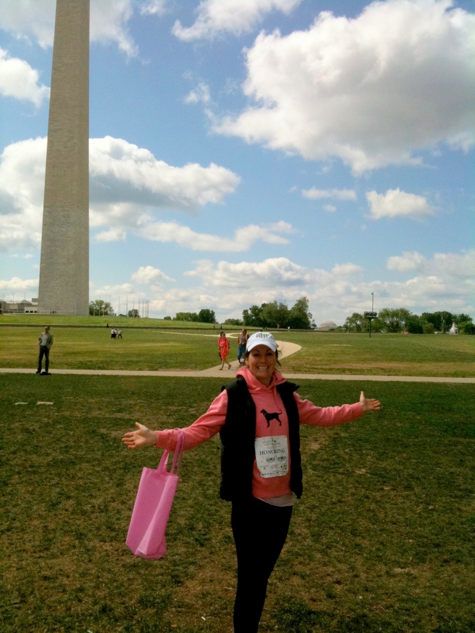 Walking towards the Washington Monument, I noticed a few other women walking in the same direction, also wearing pink. In the distance, I heard an inspirational U2 song blasting from a loudspeaker – I walked faster. Finally, I rounded one last corner and saw the stage, the tables, the tents, and the large crowds of people gathered. My throat tightened up, I was overwhelmed with emotion.